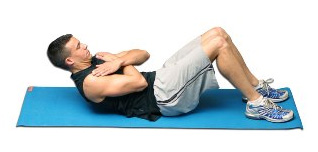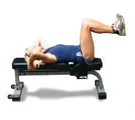 These exercises will help you develop core strength and don't require a lot of equipment. The Floor Crunch can be done on any flat surface that's comfortable for you. The Reverse Crunch can be performed using a picnic table bench rather than a weight bench. You do need a stability ball for the Ball Crunch with Rotation, but these are relatively inexpensive and can be used with hundreds of other exercises (plus you can use it as chair when working on a computer or watching TV, and you'll burn more calories!).