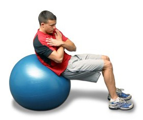 - Draw your abdominals in and slowly crunch while rotating your upper body to a position in which you can maintain neutral hip alignment. Keep your chin tucked in to prevent a forward-head posture. Hold the top position 2 seconds, then slowly return to the starting position, rounding your back over the ball while maintaining the drawing-in maneuver. Repeat to the opposite side.
